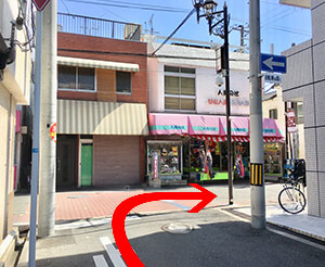 真っ直ぐ進んで頂くと京街道商店街にでます。そこを右に曲がってください。